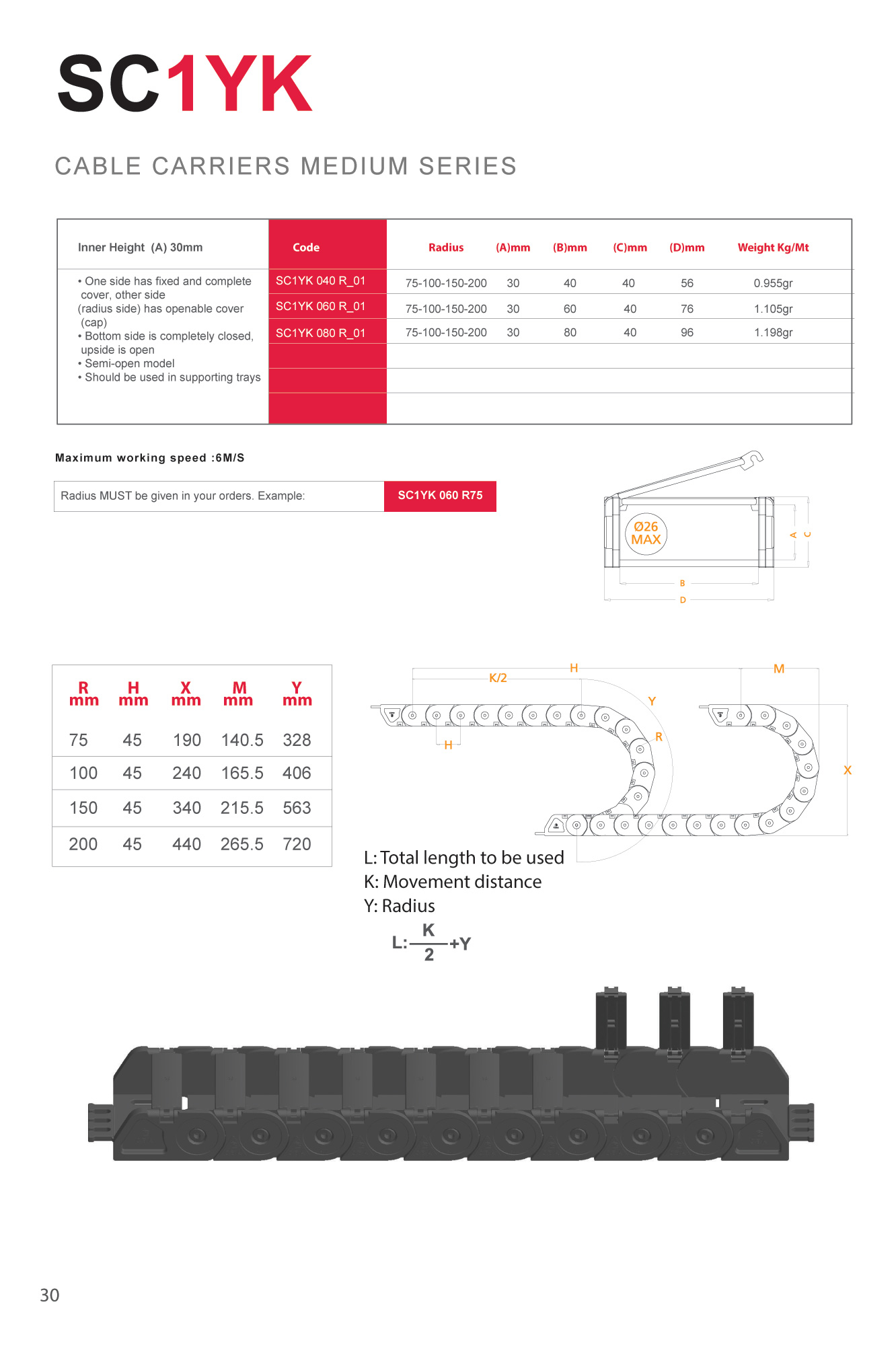 Cable carriers, inner height is between 20 mm – 40 mm and have different inner widths. Caps/lids can be opened.
