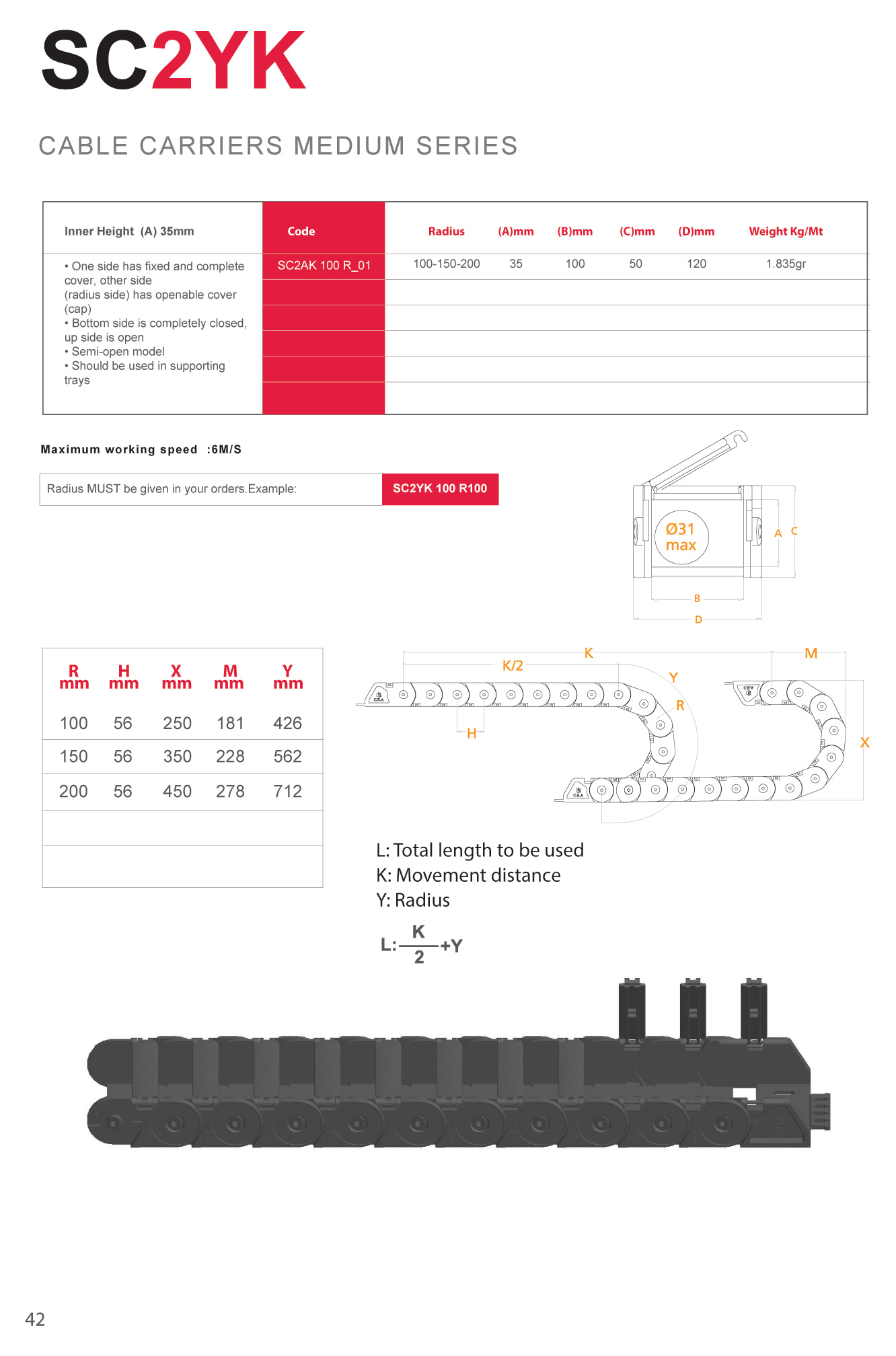 Cable carriers, inner height is between 40 mm – 80 mm and have different inner width.Both up and bottom sides have movable lids. This series has three different cover/lid types; without lids, lids only in one side, lids on both sides. Suitable for heavy conditions.