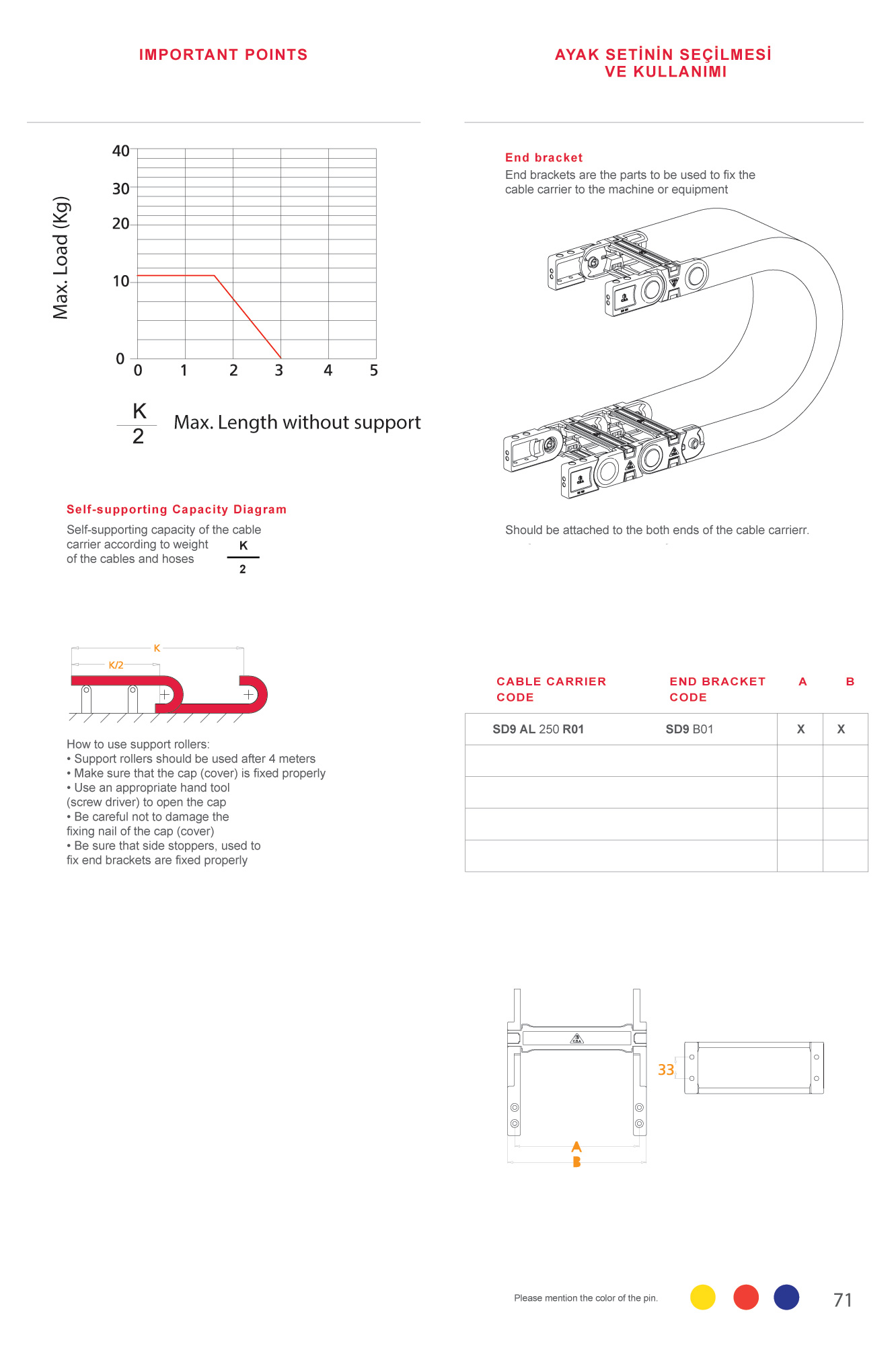 Hareketli kablo taşıyıcısı iç yüksekliği 52 mm.olup iç genişliği 250-300-350-400-450-500-600-650-700 mm açık modeldir. Ağır yüklerin ve zorlu şartların bulunduğu yerlerde kullanılması uygundur.İçten açılabilir çıtalıdır.
