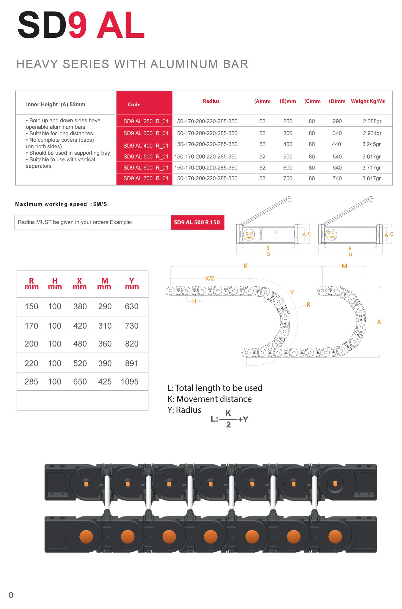 Hareketli kablo taşıyıcısı iç yüksekliği 52 mm.olup iç genişliği 250-300-350-400-450-500-600-650-700 mm açık modeldir. Ağır yüklerin ve zorlu şartların bulunduğu yerlerde kullanılması uygundur.İçten açılabilir çıtalıdır.
